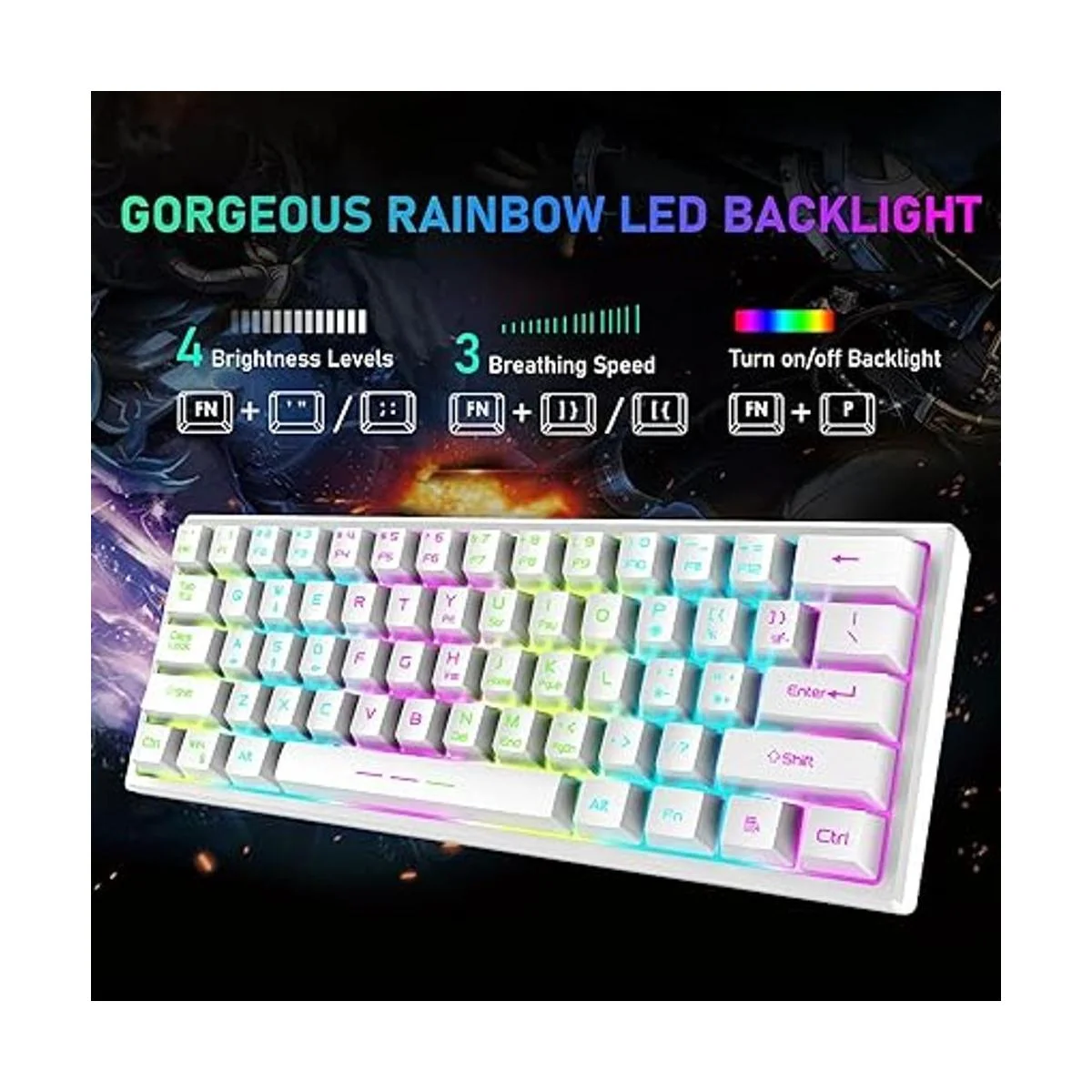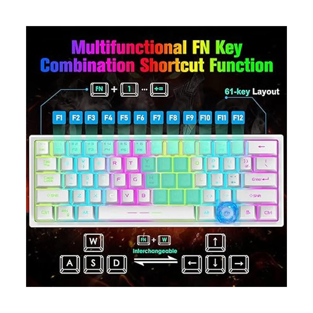 Diseño compacto del 60: este teclado inalámbrico para juegos está diseñado con un diseño minimalista de 61 teclas, tamaño pequeño, utiliza tu escritorio hasta la máxima medida, da más espacio para el movimiento del mouse, ligero, inalámbrico y función recargable que lo hace portátil, carácter brillante, teclas extraíbles, fácil de limpiar y reemplazar, no te preocupes por el desgaste, la función de combinación de teclas FN hace que sea fácil acceder a más teclas funcionan como un teclado de tamaño completo, muy práctico.
