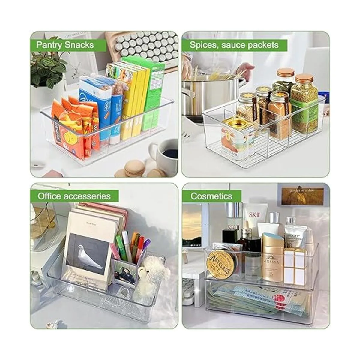 ZIZOTI Contenedores de organización y almacenamiento de despensa de alimentos, paquete de 8 estantes organizadores de aperitivos extraíbles de plástico transparente con 3 divisores, ideal para organizar paquetes, especias, bolsas apilables para refrigerador, cocina, gabinetes