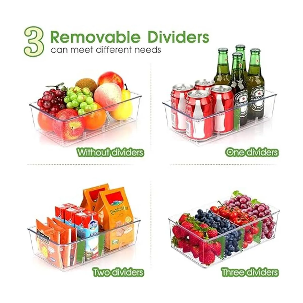 Contenedores organizadores de aperitivos con prácticos divisores Cada divisor extraíble se puede ajustar según sea necesario y se puede quitar según sea necesario para adaptarse a artículos más grandes. La parte fresca es que los separadores son extraíbles si necesitas menos compartimentos.