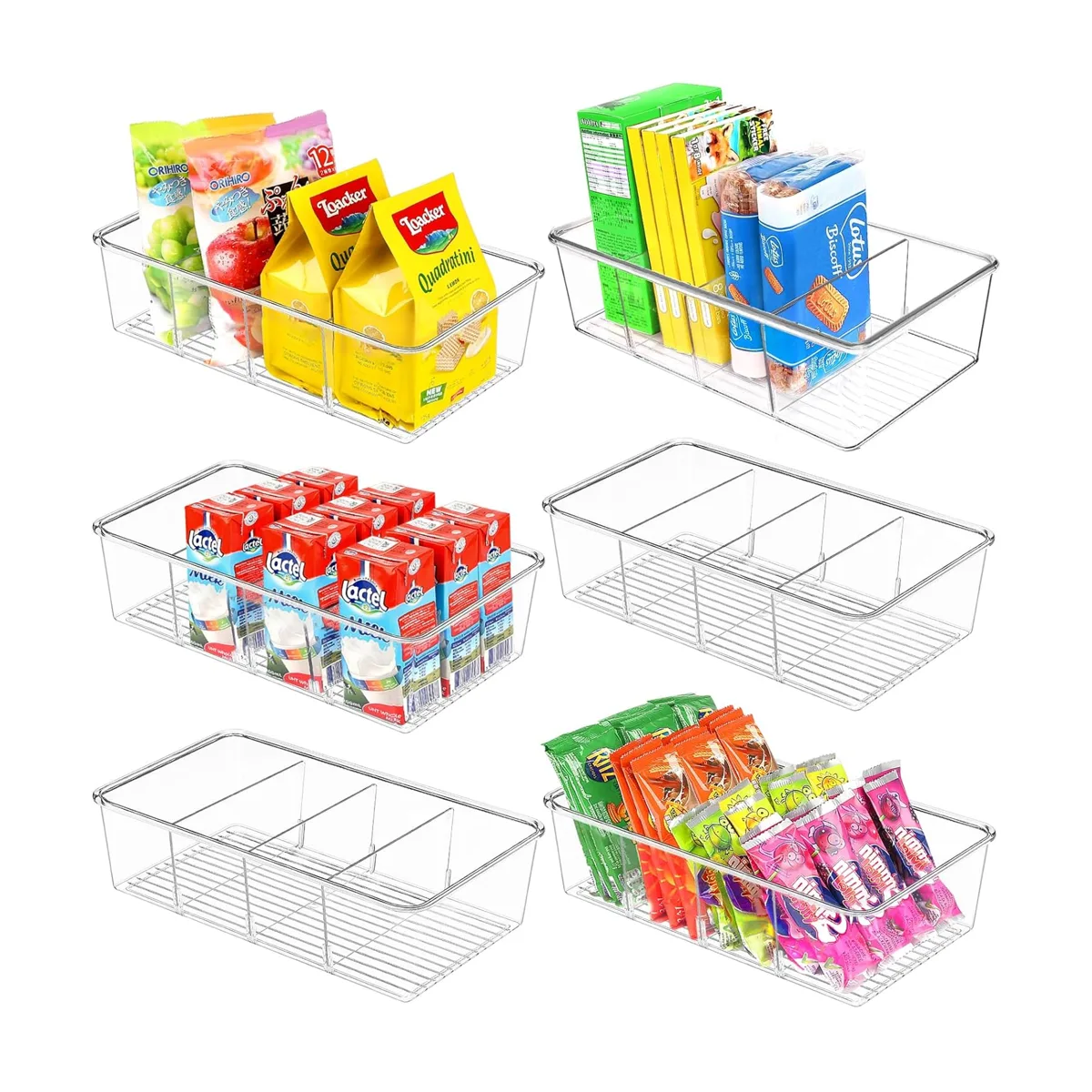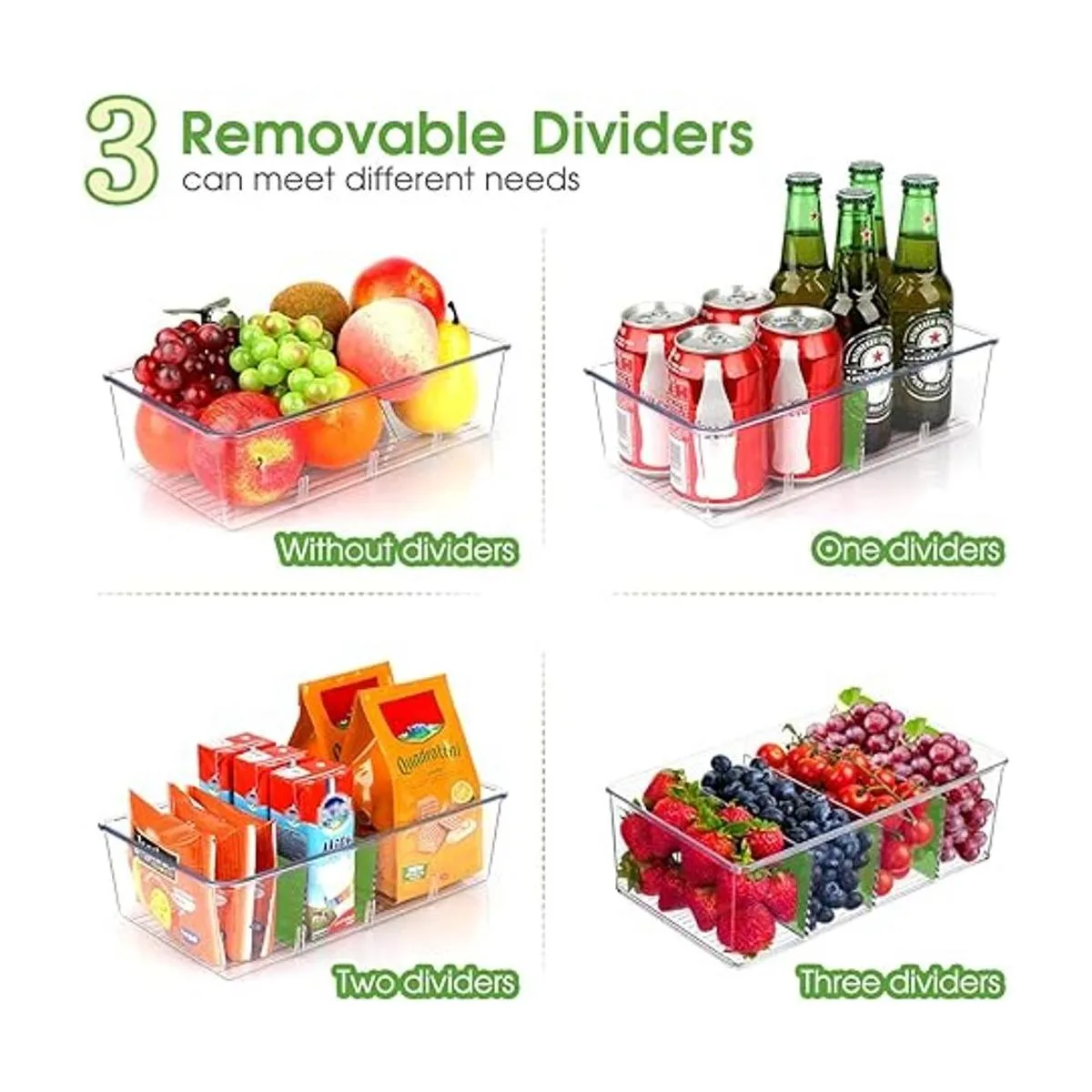 Contenedores organizadores de aperitivos con prácticos divisores Cada divisor extraíble se puede ajustar según sea necesario y se puede quitar según sea necesario para adaptarse a artículos más grandes. La parte fresca es que los separadores son extraíbles si necesitas menos compartimentos.