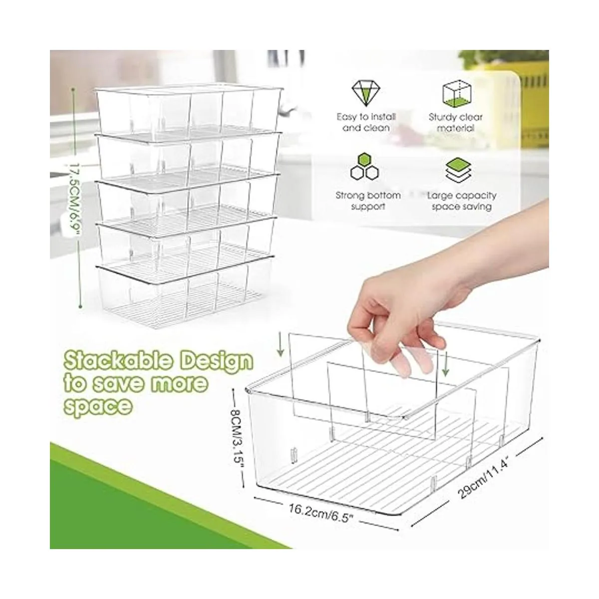 Tamaño cuidadoso y funcional versátil 5 contenedores de almacenamiento del mismo tamaño miden 11.2 x 6.3 x 3.15 pulgadas; encajan perfectamente en tus armarios o despensa. Ideal para organizador de aperitivos, armarios de cocina y encimeras y congeladores de refrigerador, contenedores de despensa, organizadores de cajones, aderezo de ensalada, accesorios de oficina, cosméticos, piezas de lego, suministros de manualidades, especias, paquetes de salsa.