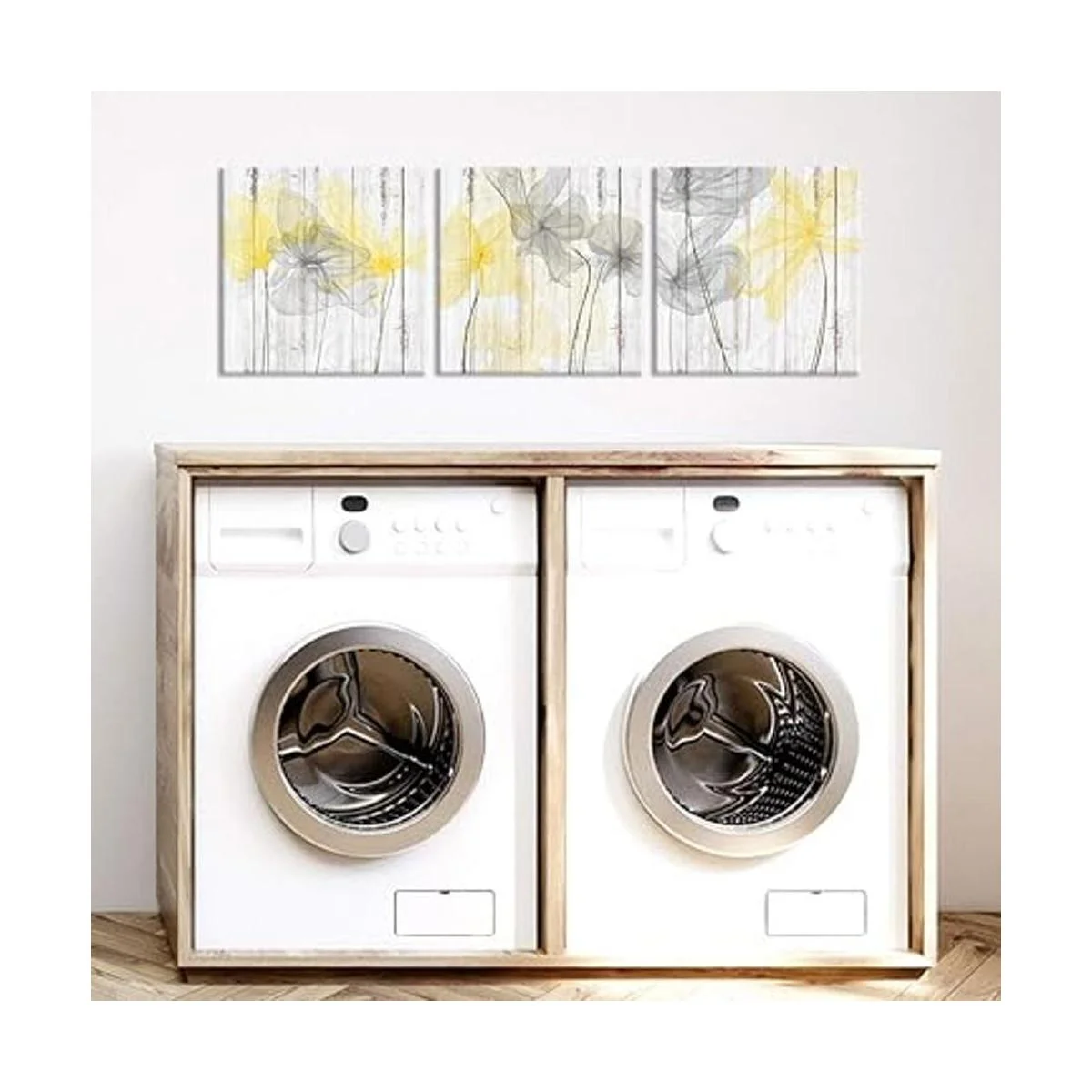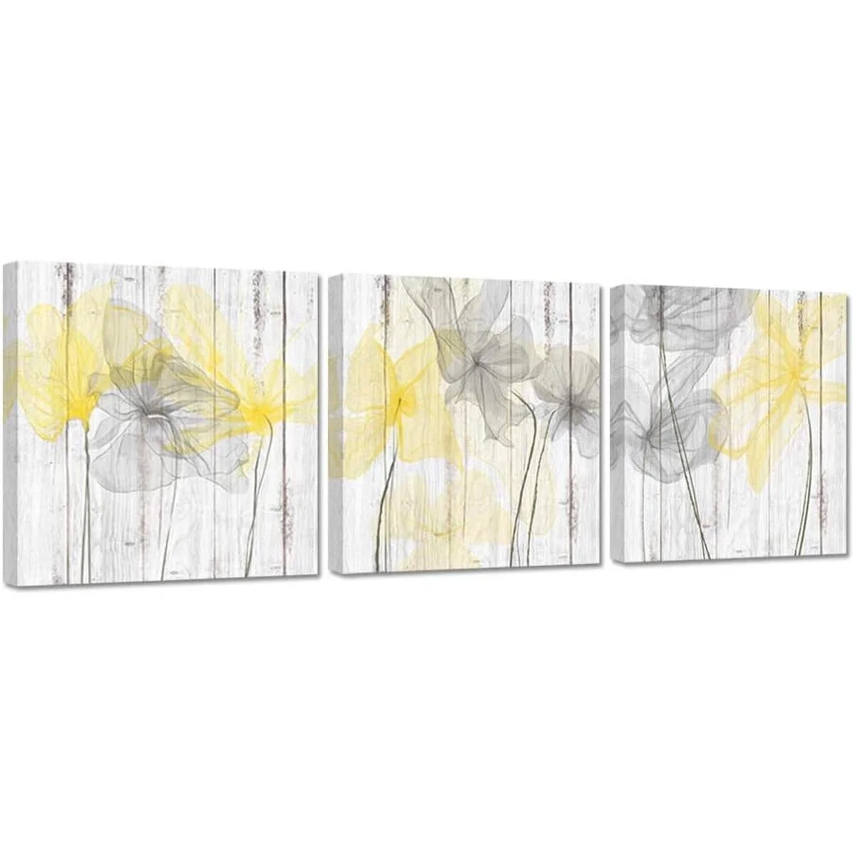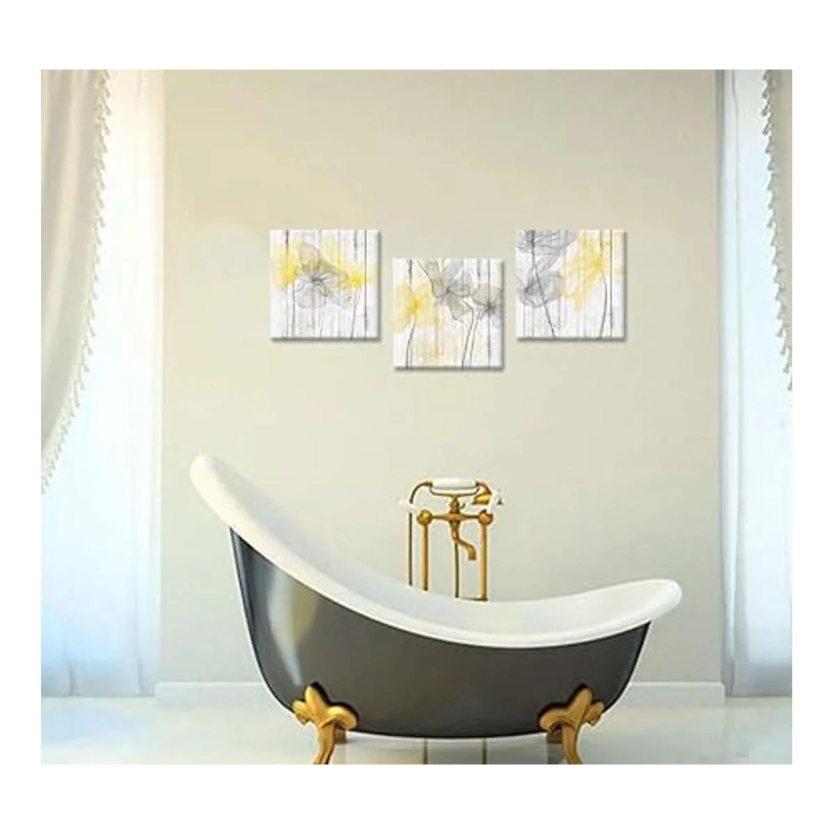 Zlove 3 piezas de decoración de pared de baño, amarillo y gris, flor de baño sobre fondo de madera rústica, estirada y enmarcada para ducha, dormitorio, sala de estar, lista para colgar, 12 x 12 pulgadas x 3 piezas