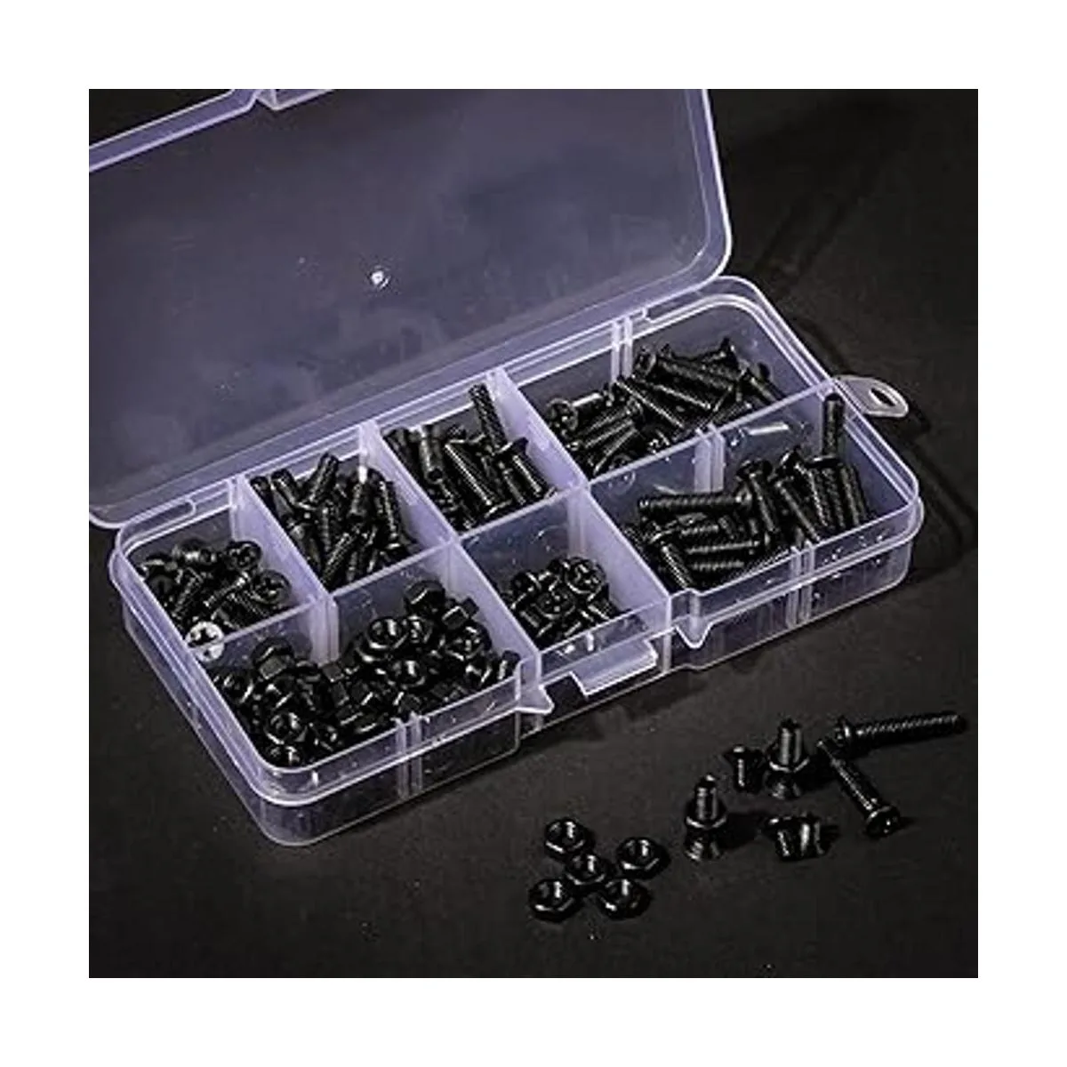 El paquete incluye 6 tamaños de tornillos de máquina M4 y 100 tuercas de tornillo negras, tornillos negros. Tamaños: M2.0.197 x 0.118 in/0.157 in/0.197 in/0.236 in/0.315 in/0.394 in/0.472 in/0.551 in