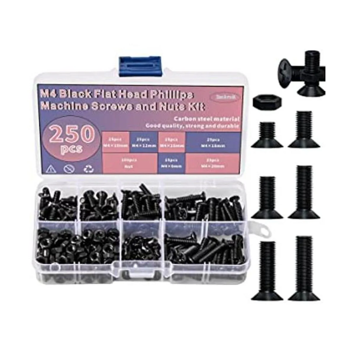 Zmbroll 250 tornillos de cabeza plana M4, tornillos Phillips negros, tuercas surtidas, M4 x 0.236 in0.394 in0.472 in0.630 in0.709 in0.787 in