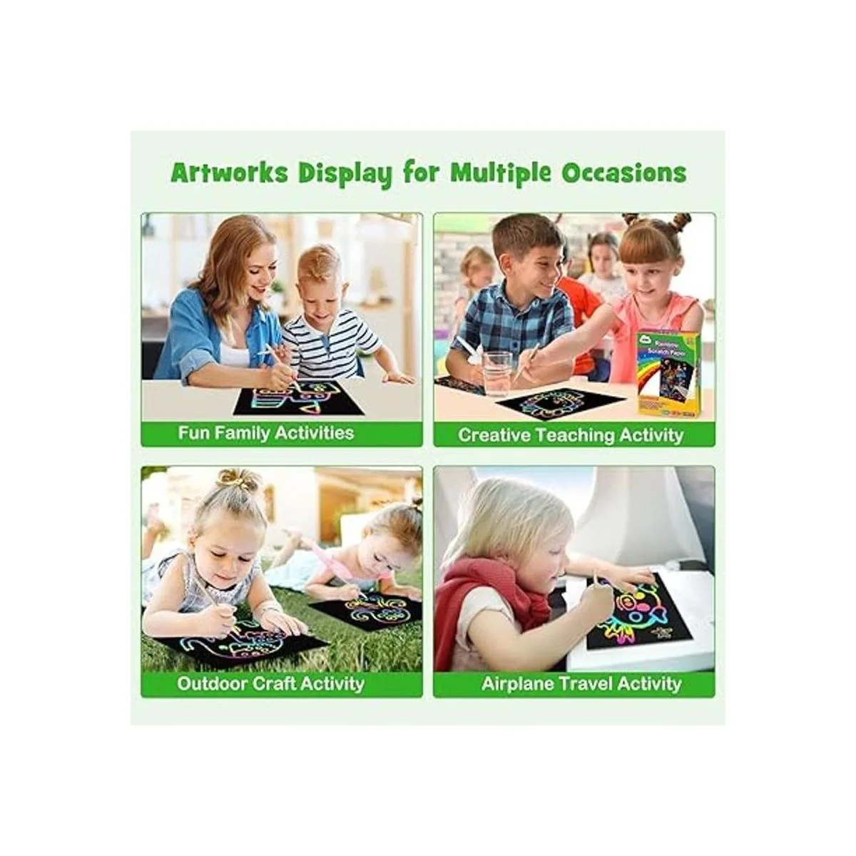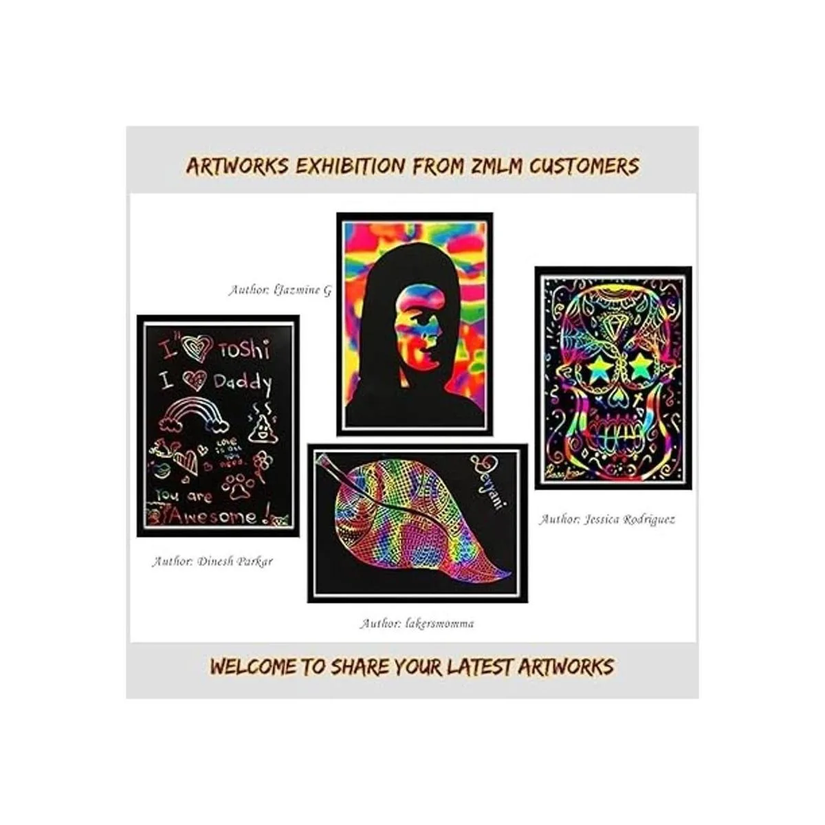 Papel para rayar: Utiliza el rascador para rascar la superficie mate negra del papel, revelando el fondo, por lo que es divertido y permite crear obras de arte creativas, letreros y mucho más. Es una excelente actividad artística y artesanal para niños o artistas adultos.