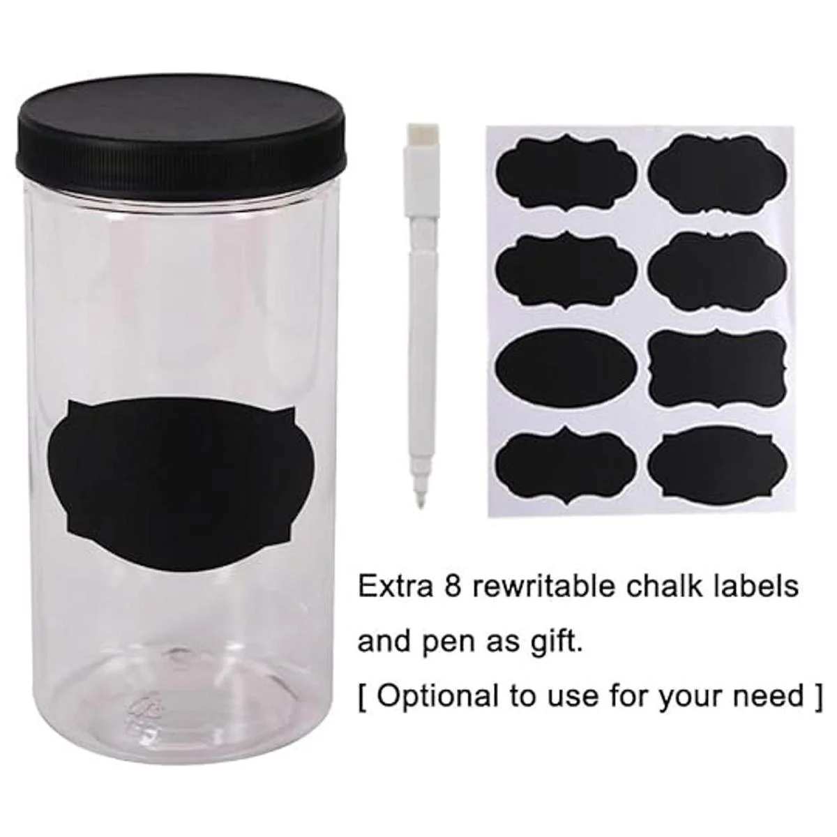 El paquete contiene: 6 tarros grandes de plástico transparente de 32 onzas con tapas. 8 etiquetas de tiza regrabables adicionales y un bolígrafo como regalo opcional para usar según tus necesidades.