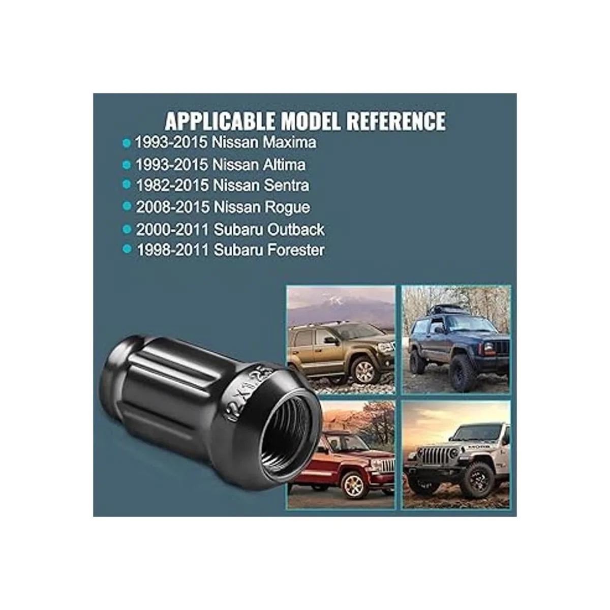 Ajuste del vehículo: repuesto para Maxima 19882021, Altima 19932021, Sentra 19822015, Rogue 20082015, Juke 20112015, Pathfinder, 20002015. 015 XI XI Terra, 20032009 350z; reemplazo para Subaru: 20002011 Outback, 19982011 Forester; reemplazo para Infiniti: 20032008 G35, 20082013 G37. Ruedas de asiento de bellota roscadas de 0.472 x 0.049 in. Y se adapta a más tuercas hexagonales de rueda de asiento cónica/bellota m12 x 1.25 3/4 pulgadas.