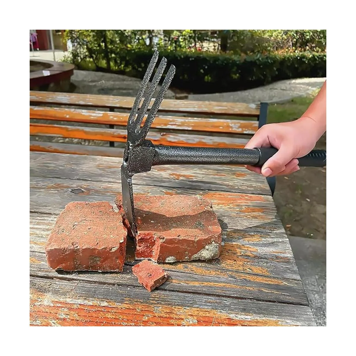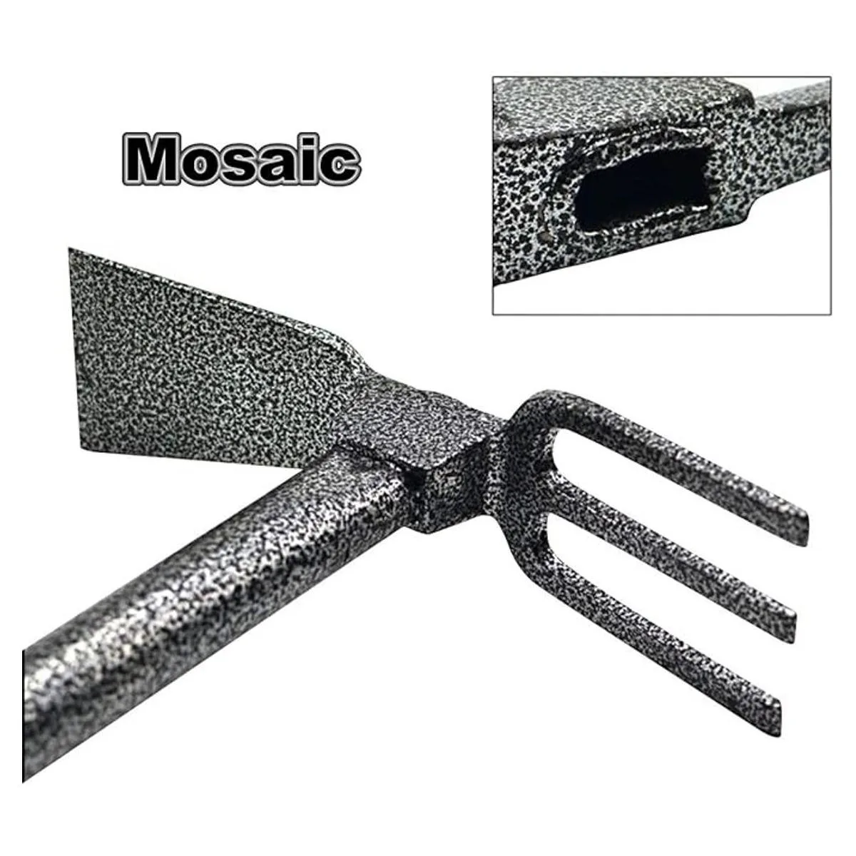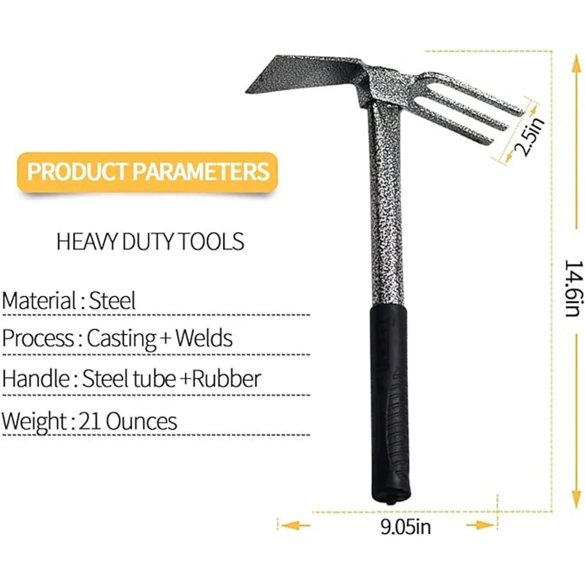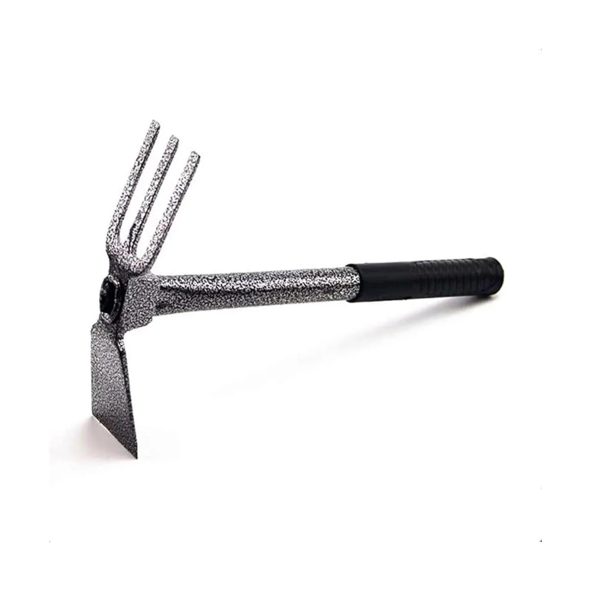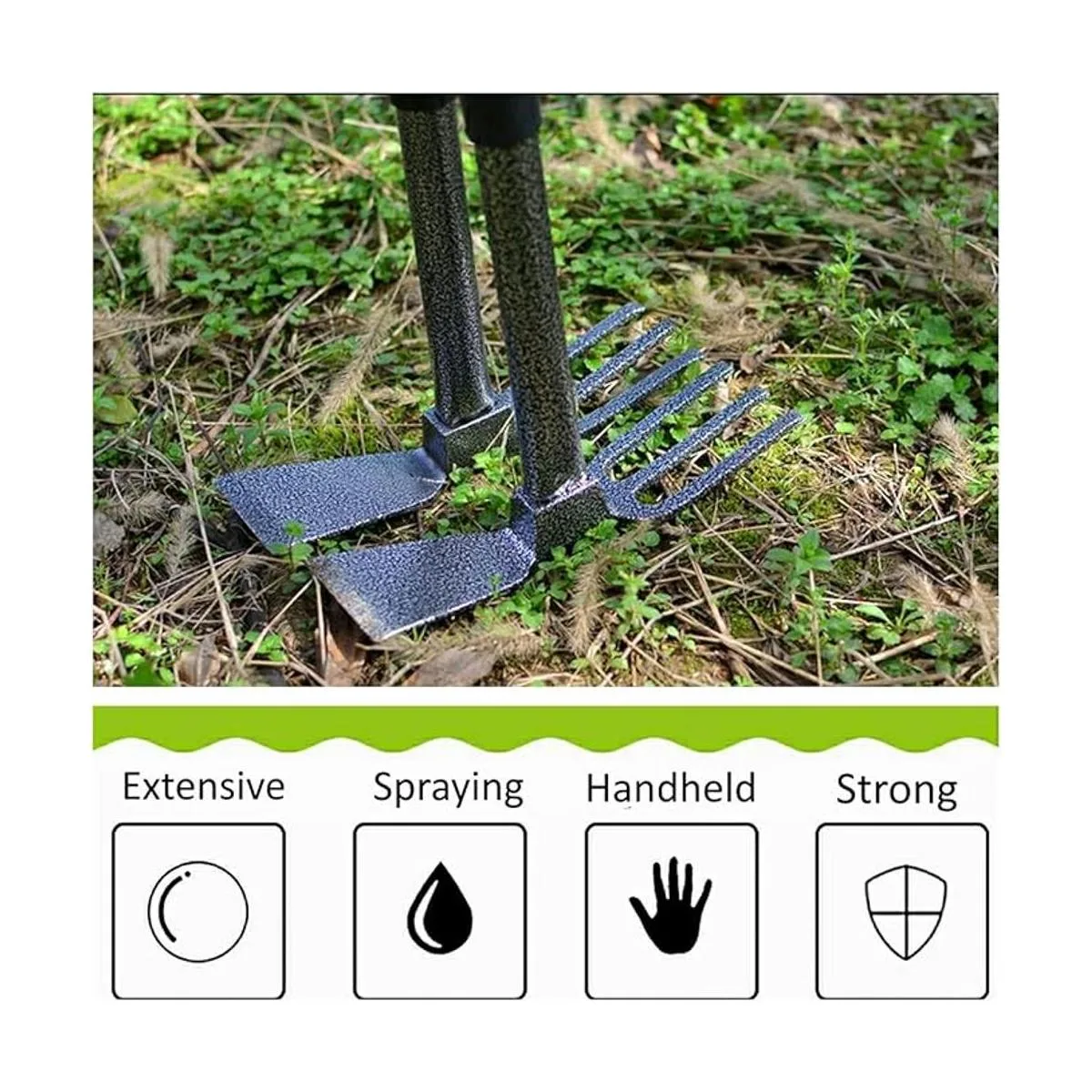 Doble cabeza Este timbre de jardín está diseñado con una cabeza doble, estructura de péndulo de reloj, equilibrio de peso perfecto, ondulando libremente hacia arriba y hacia abajo. Con un lado con las tres puntas de acero resistentes para romper, labrar tierra y surco. Mientras que el otro lado es una azada con un borde ligeramente afilado que es perfecto para cortar y alisar.
