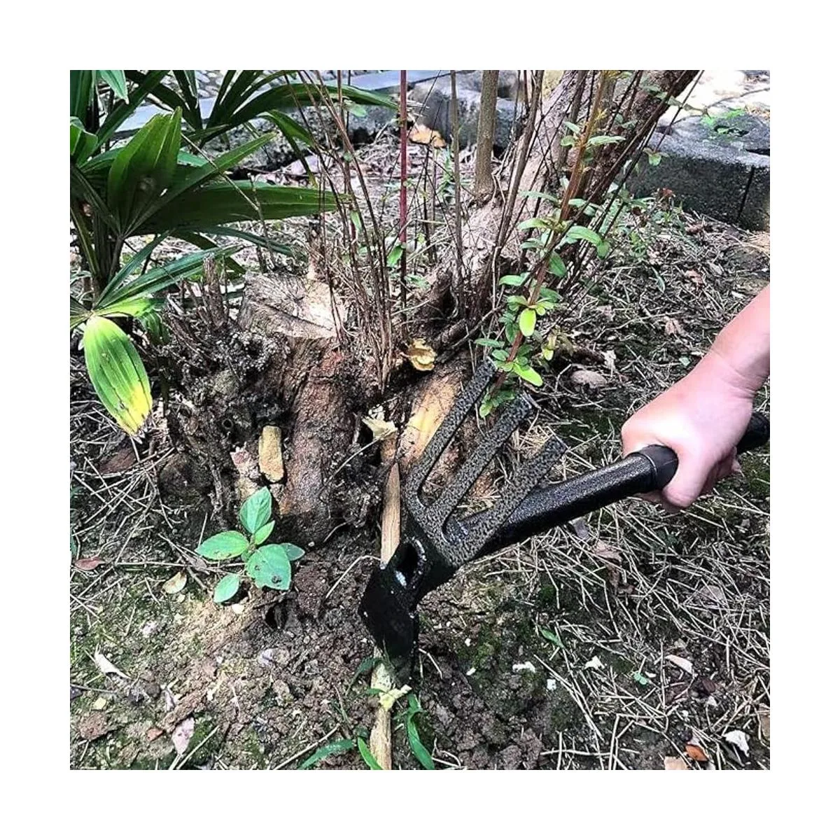 Herramienta resistente Nuestro timbre de mano resistente está hecho para mayor durabilidad, a prueba de dobleces, puede soportar las raíces más duras, ladrillos y tierra. Se puede utilizar con una mano o ambas manos. Azada de jardín perfecta para jardines de flores y verduras.