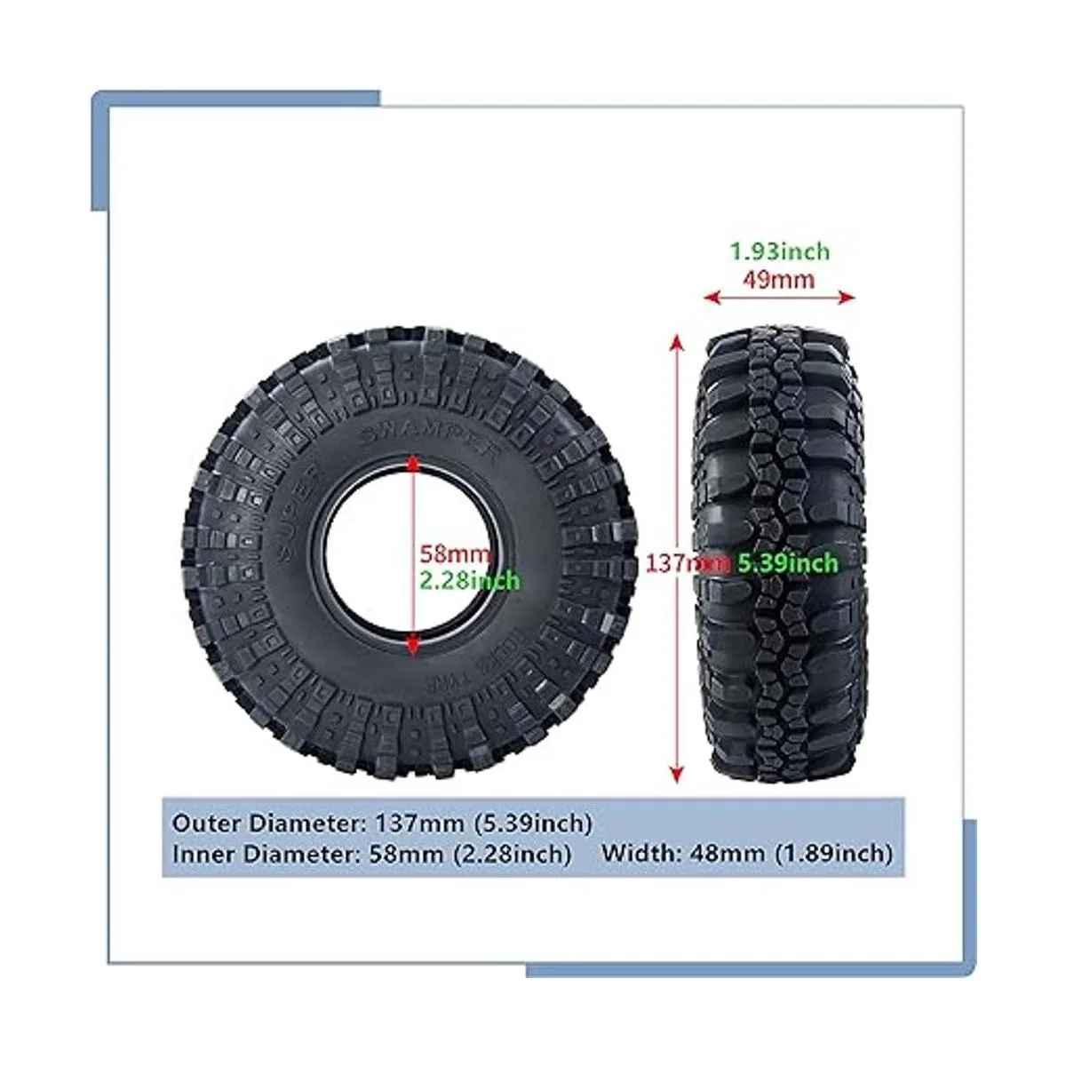 El paquete incluye 4 neumáticos de 2.2 pulgadas de 5.394 in y 4 espumas interiores de neumáticos como se muestra.