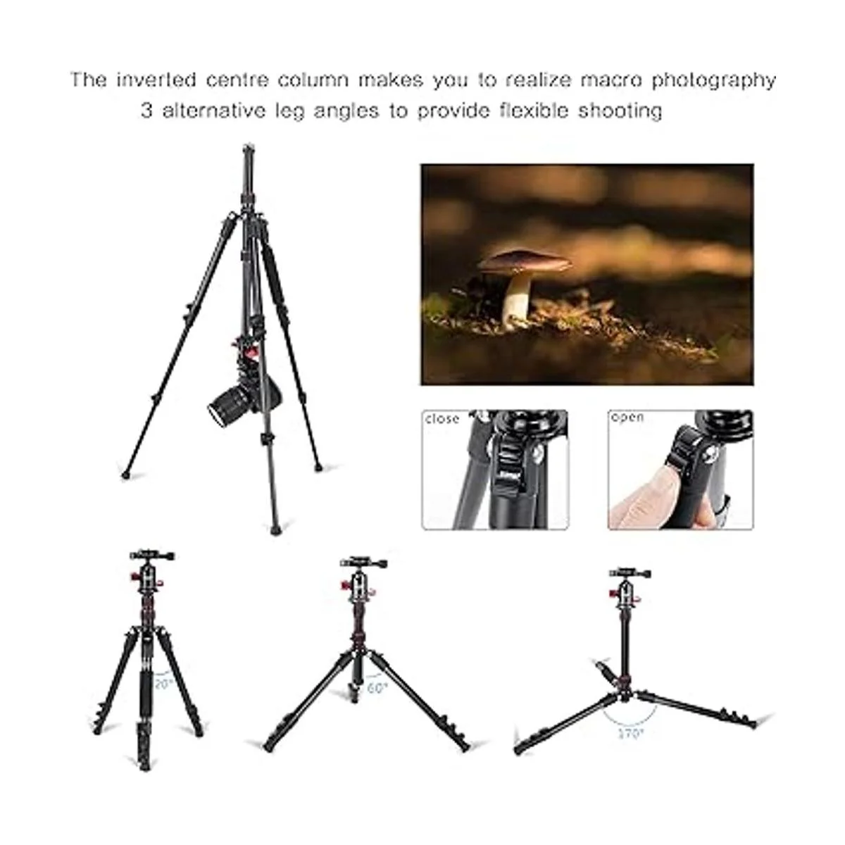 Multifuncional: este trípode está diseñado con columnas centrales telescópicas dobles, compacto cuando está plegado y práctico cuando está extendido. Soporte para fotografía macro, se puede utilizar como un alpenstock y monopié.