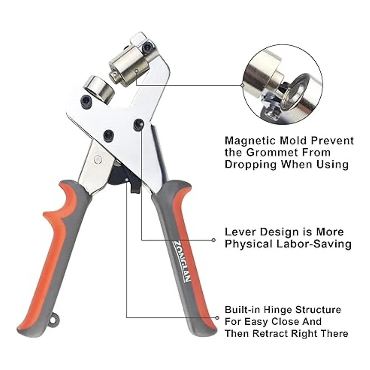 Fácil de usar: juego de alicates de ojales Zonglan con troquel superior magnético y el ojal de ranura de soplado para que no tengas que alinear los ojales por ti mismo, simplemente aprieta.