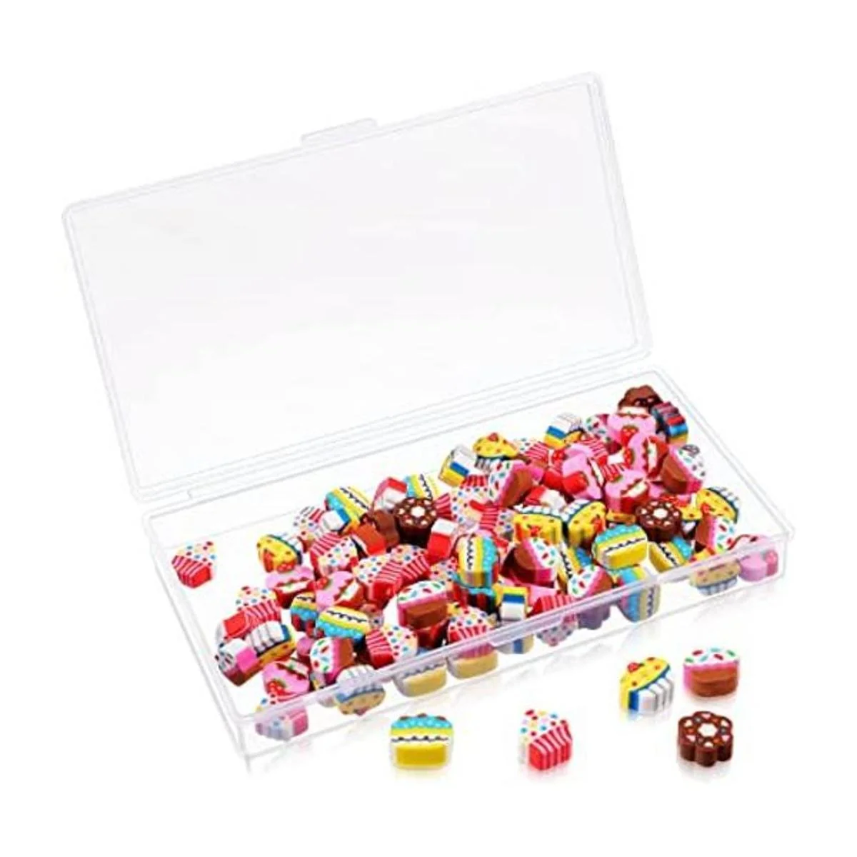El paquete incluye: recibirás 100 borradores novedosos y 1 caja de almacenamiento transparente, estos mini borradores de lápiz están en colores y formas mixtas, el tamaño de ellos es de aproximadamente 1 a 0.8 in, aspecto lindo y vivo, hará que tu estudio aburrido esté lleno de ambiente feliz