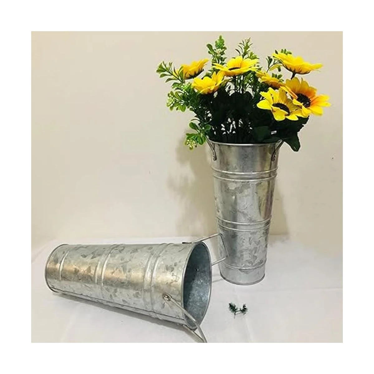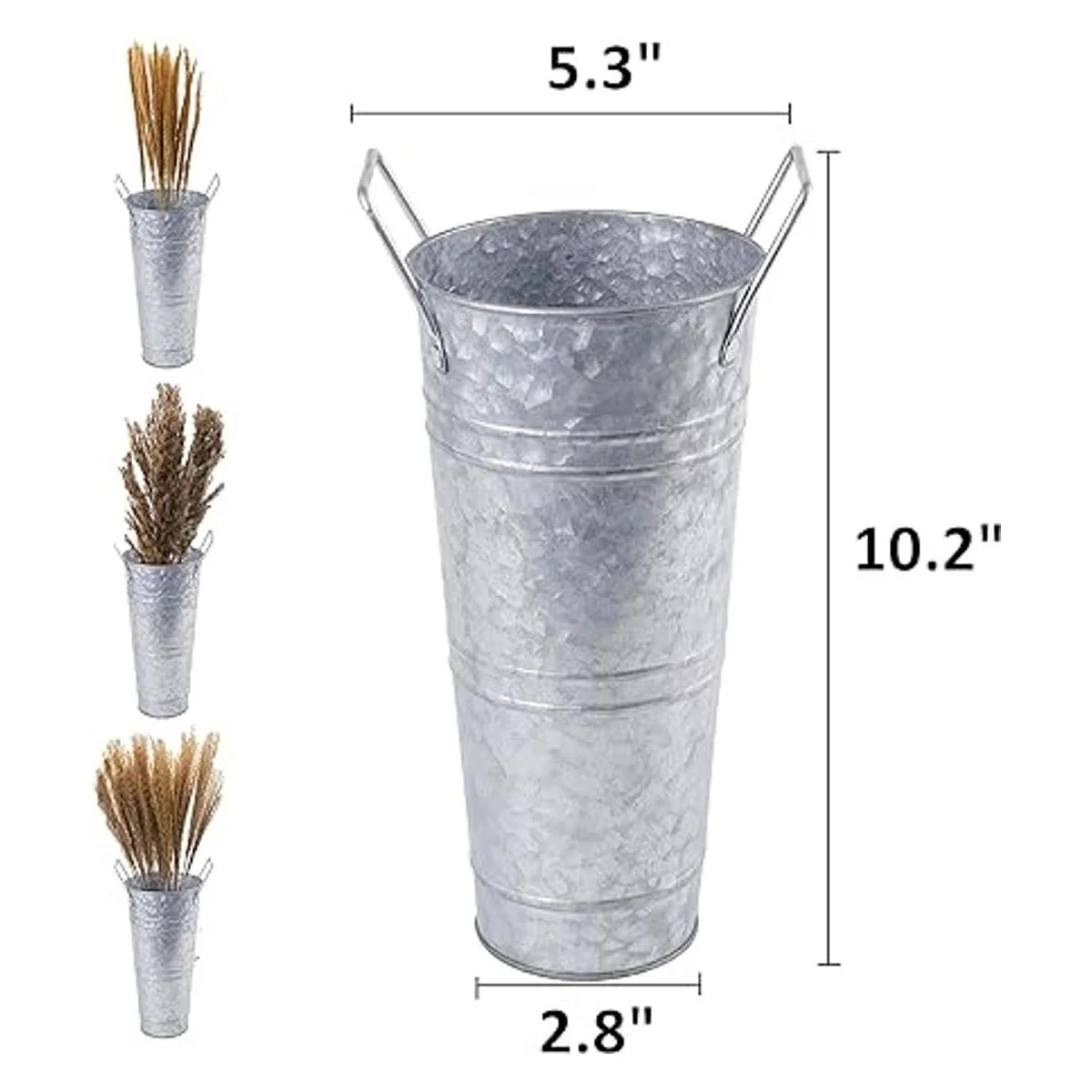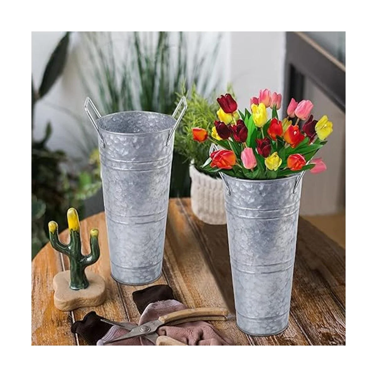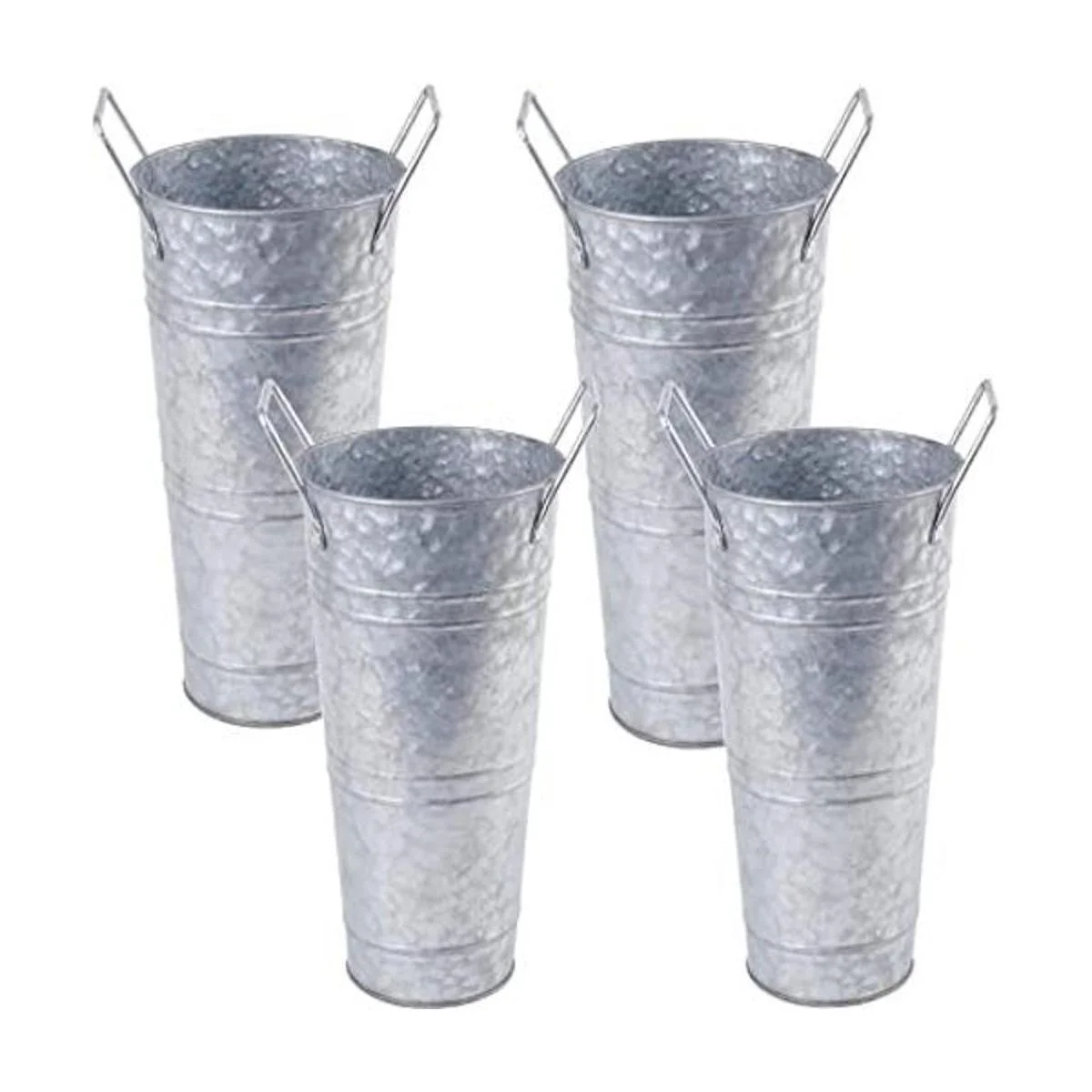 ZOOFOX Juego de 4 jarrones de metal galvanizado, cubo francés de 9 pulgadas con asas, soporte de flores de metal de estilo rústico para decoración del hogar y la mesa de boda plata