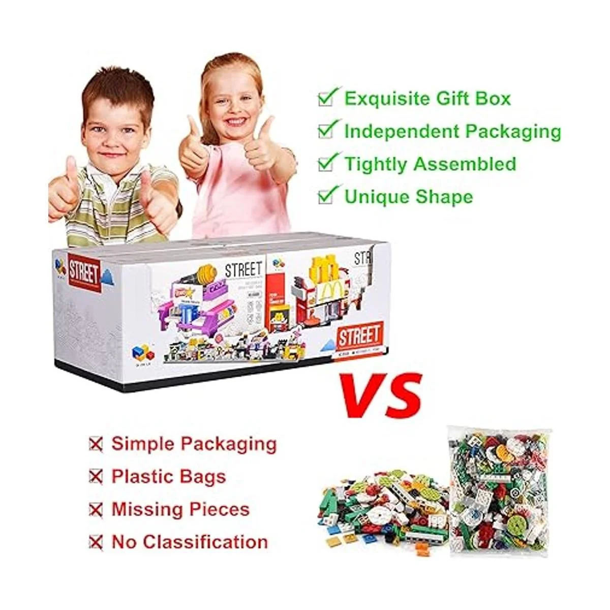 La caja tiene todo lo que los niños necesitan para crear una calle comercial de la ciudad, incluyendo estación de hamburguesas, cafetería, tienda de postres, peluquería, tienda de dulces, casa de cerveza, estación expresa y mucho más.