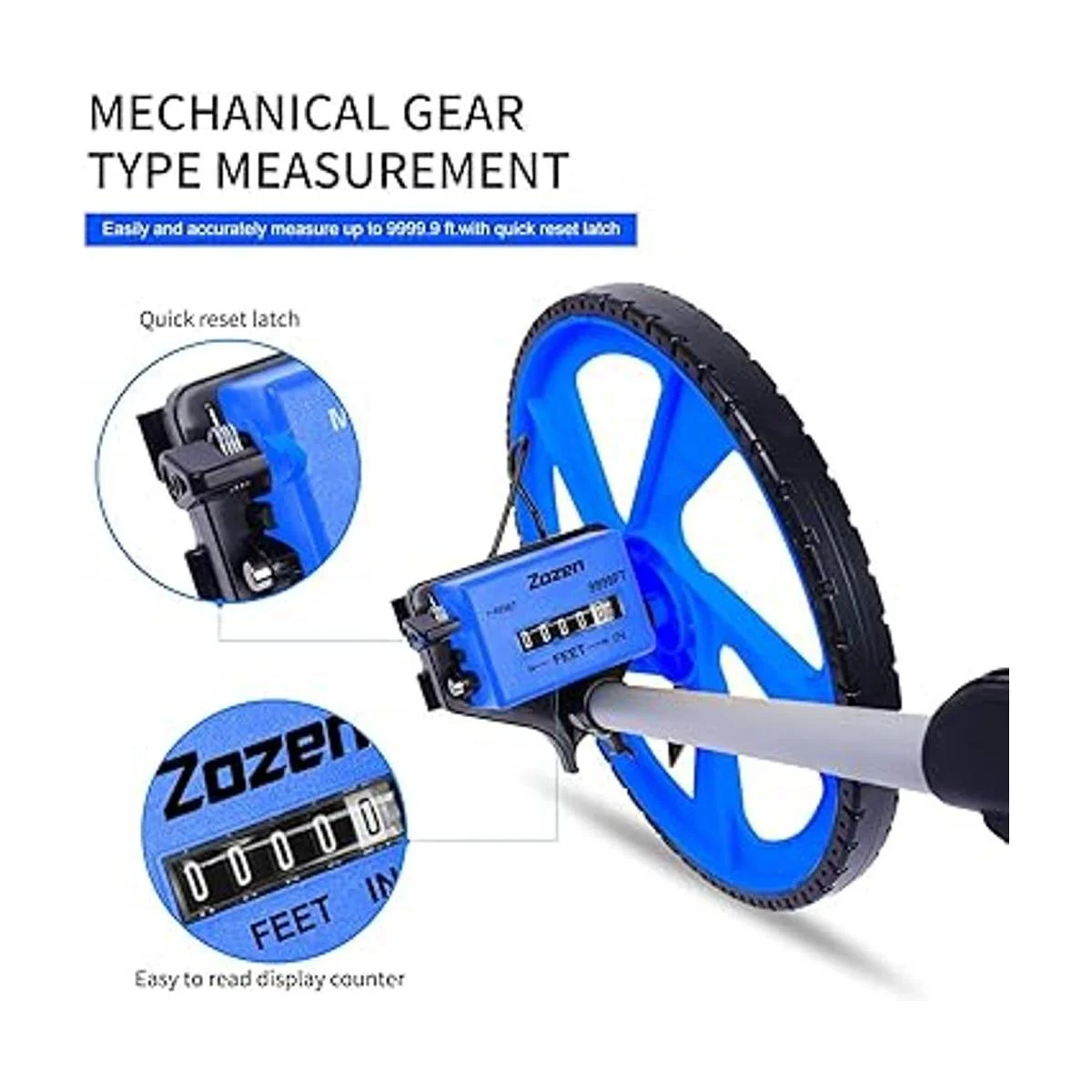 Rueda de medición azul Zozen: reinicio de una tecla, soporte más grande, juntas rediseñadas, neumáticos TPR roscados, mayor fricción, marcador de ubicación original, exquisita mochila Zozen. El mango cuenta con un gran tamaño para mayor comodidad.