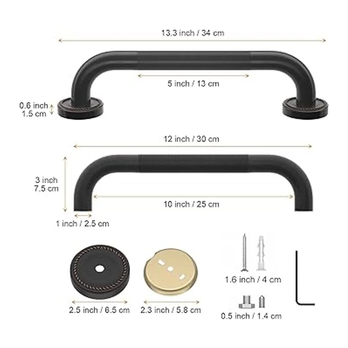 El diseño de tornillo oculto de montaje en pared permite una instalación fácil y segura en cualquier lugar y cualquier ángulo, la barra de agarre de ducha negra de latón antiguo de 12 pulgadas te permite cubrir cualquier antiestético agujero de tornillo y continuar una tendencia limpia y elegante para tu baño y ducha.
