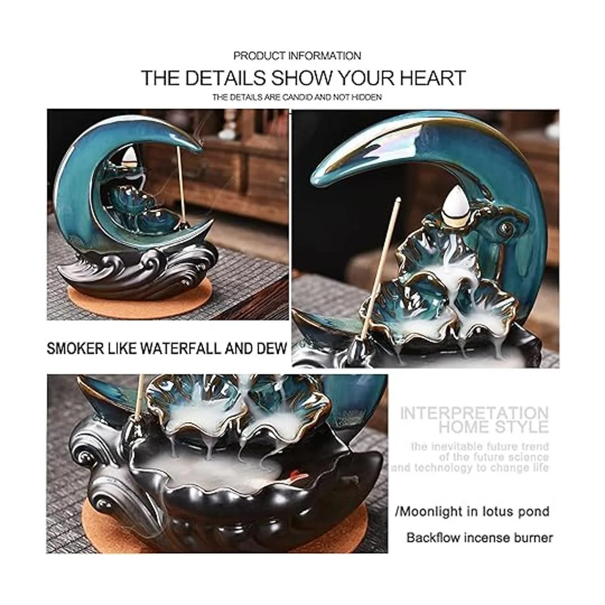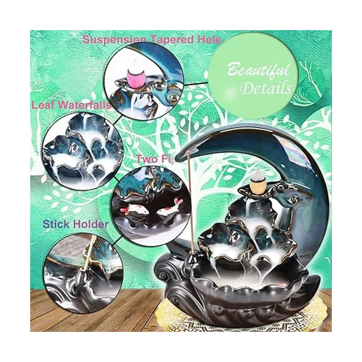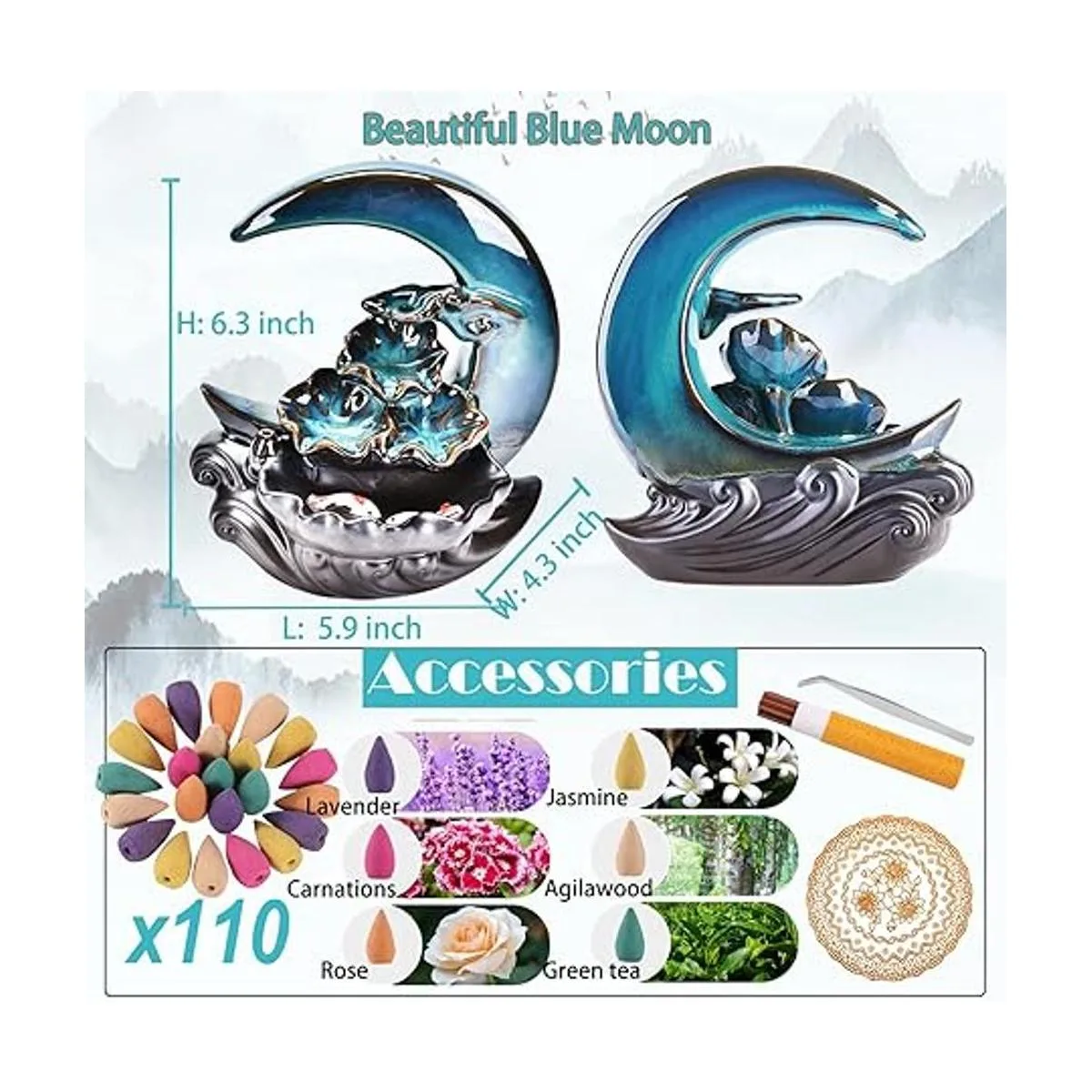 Moon Shape The Cool waterfall pouring incense burner shape is blue moon, he seems to be in the beautiful night sky. It has lotus, fish and waves, it can show a beautiful fountain like a waterfall, like a dewdrop, like a pond.