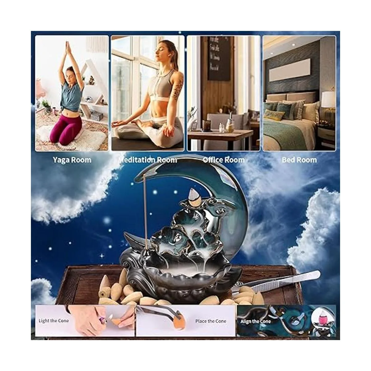 Easy Use Please place the backflow incense burner in a windless place, light the incense cone, the cone produces smoke and put it on the incense holder.You will get a beautiful waterfall of smoke and he will become your unique corner of the incense burner.
