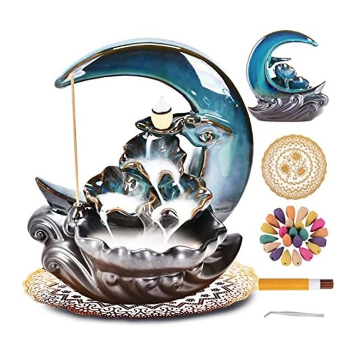 Zvaiuk New Moon Backflow Incense Holder,Waterfall Incense Burner Ceramic HandMade Incense Fountain Burner with 100 Backflow Incense ConesFragrance Incense StickmatAromatherapy Home Decoration