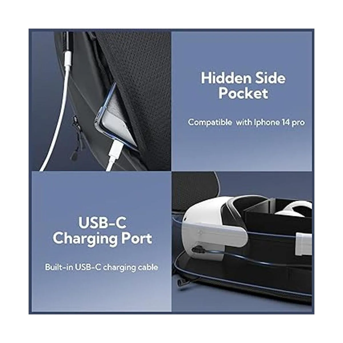 Puerto de carga USB C con cable de carga integrado. Proporciona una experiencia de carga cómoda cuando necesitas cargar auriculares de realidad virtual utilizando el banco de energía en el camino. Además, puedes cargar los auriculares Quest 2 en casa sin sacarlos de la mochila.