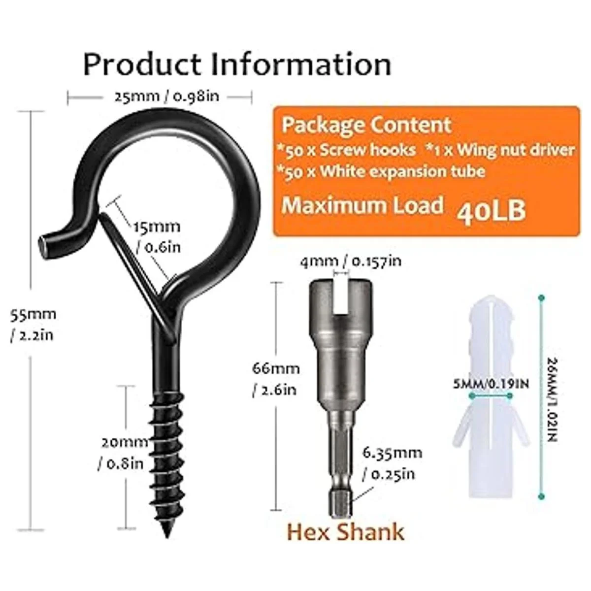 Paquete de 50: colgar de forma segura artículos ligeros, como luces al aire libre, línea de goteo, plantas, casas de pájaros, cortinas, cuerdas, tazas, comederos y mucho más. Haz que todo tipo de líneas sea más limpio después de usar este producto. Incluye 1 destornillador de tuerca de mariposa.