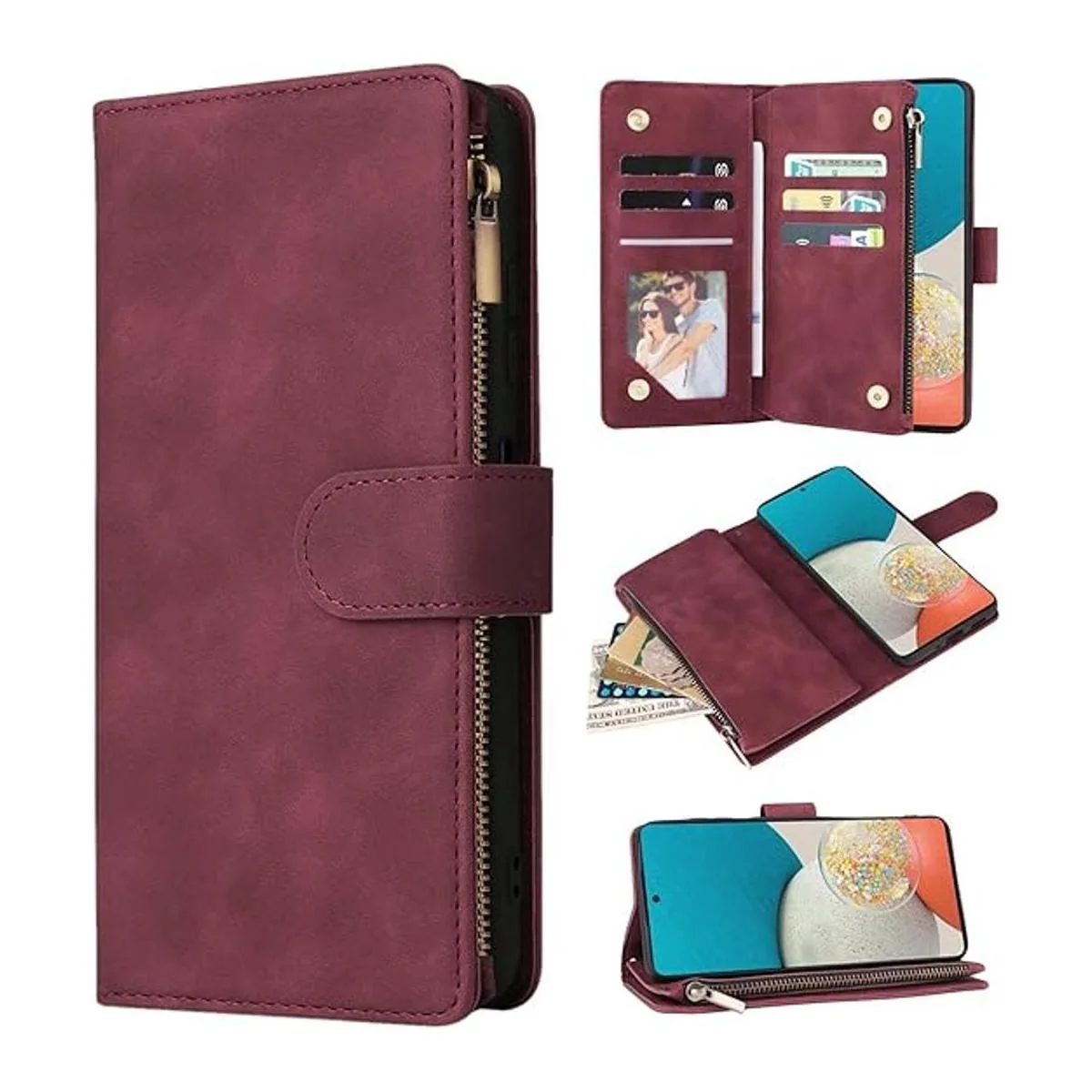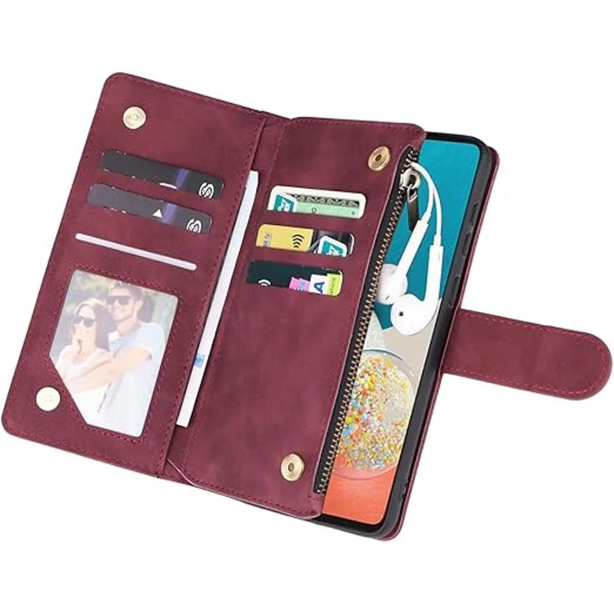 ZZXX Funda tipo cartera para Samsung Galaxy A53 5G con ranura para tarjeta de bloqueo RFID, piel sintética suave de alta calidad, con cierre de cremallera, con correa de muñeca, protector para Galaxy A53 5G rojo vino6.5 pulgadas